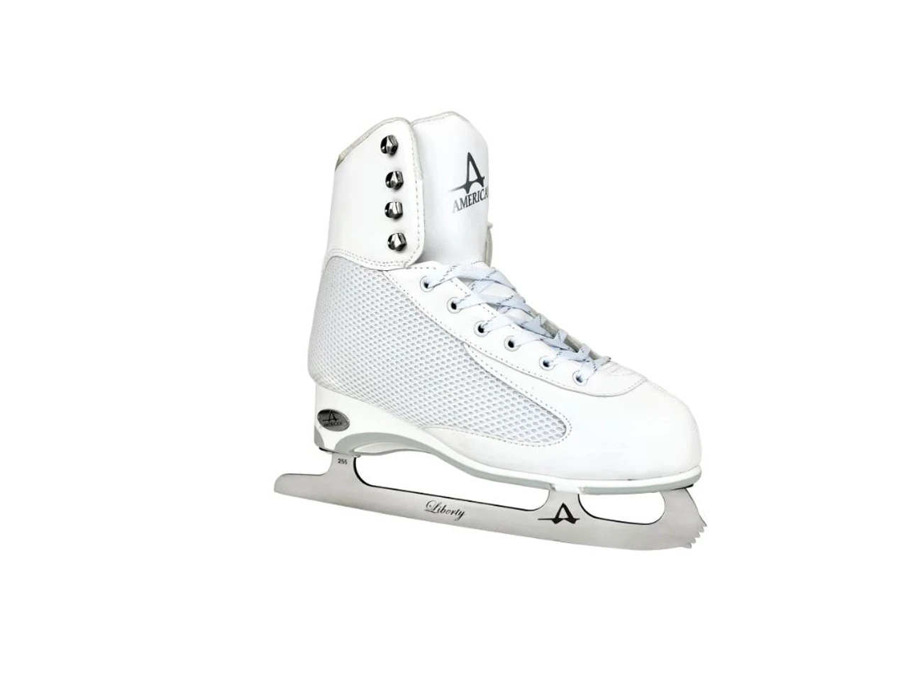Designed for comfort, balance and durability, these American WHITE ICE figure skates feature a unique, athletic look. The added ankle support through the newly developed customized PVC injection mold gives skaters extra lateral support, allowing them to stay more balanced. The breathable white inner liner softly packed with extra padding is customized for ideal fit right out of the box.