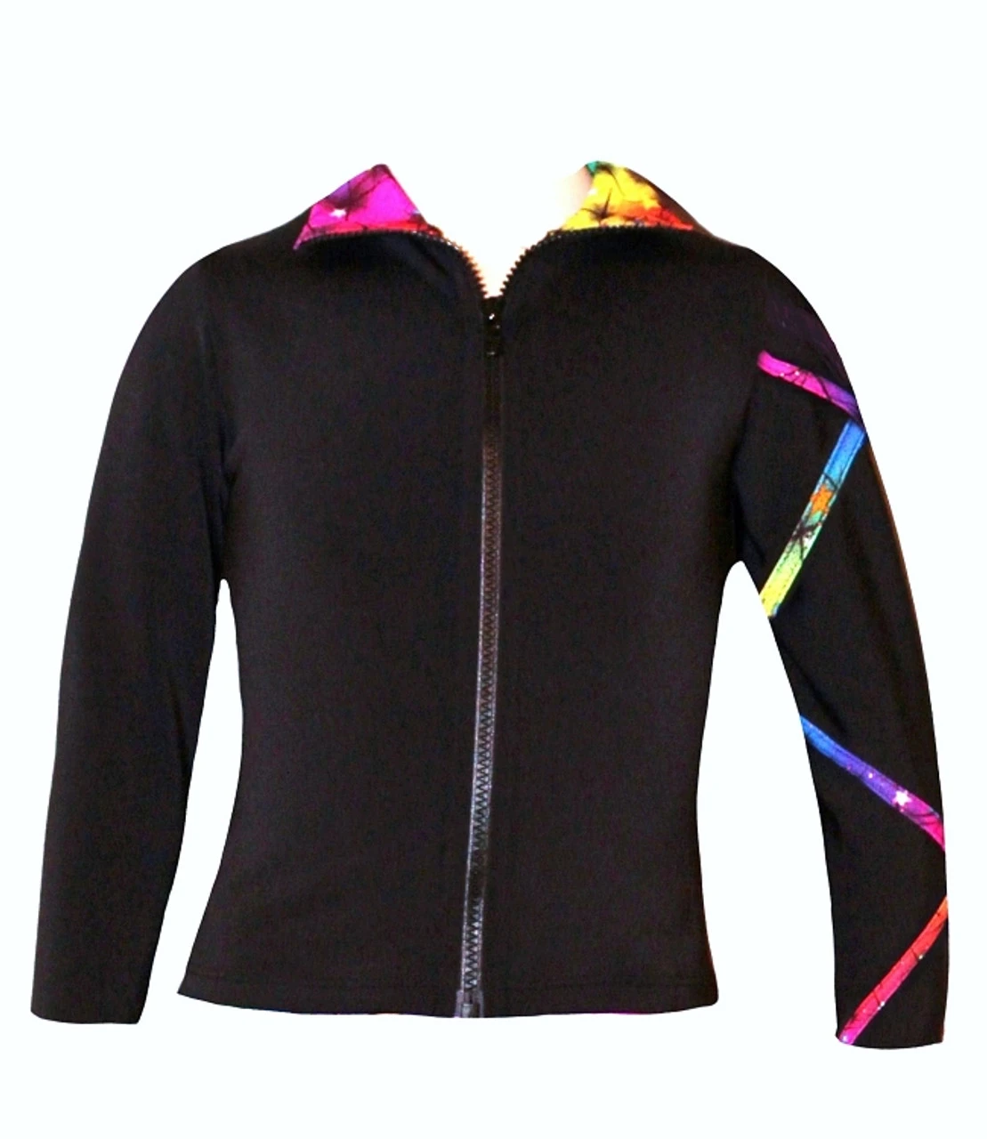 Rainbow Criss Cross ice skating jacket. High performance brushed poly spandex fabric offering soft to touch inner surface and quick drying spandex outer side.