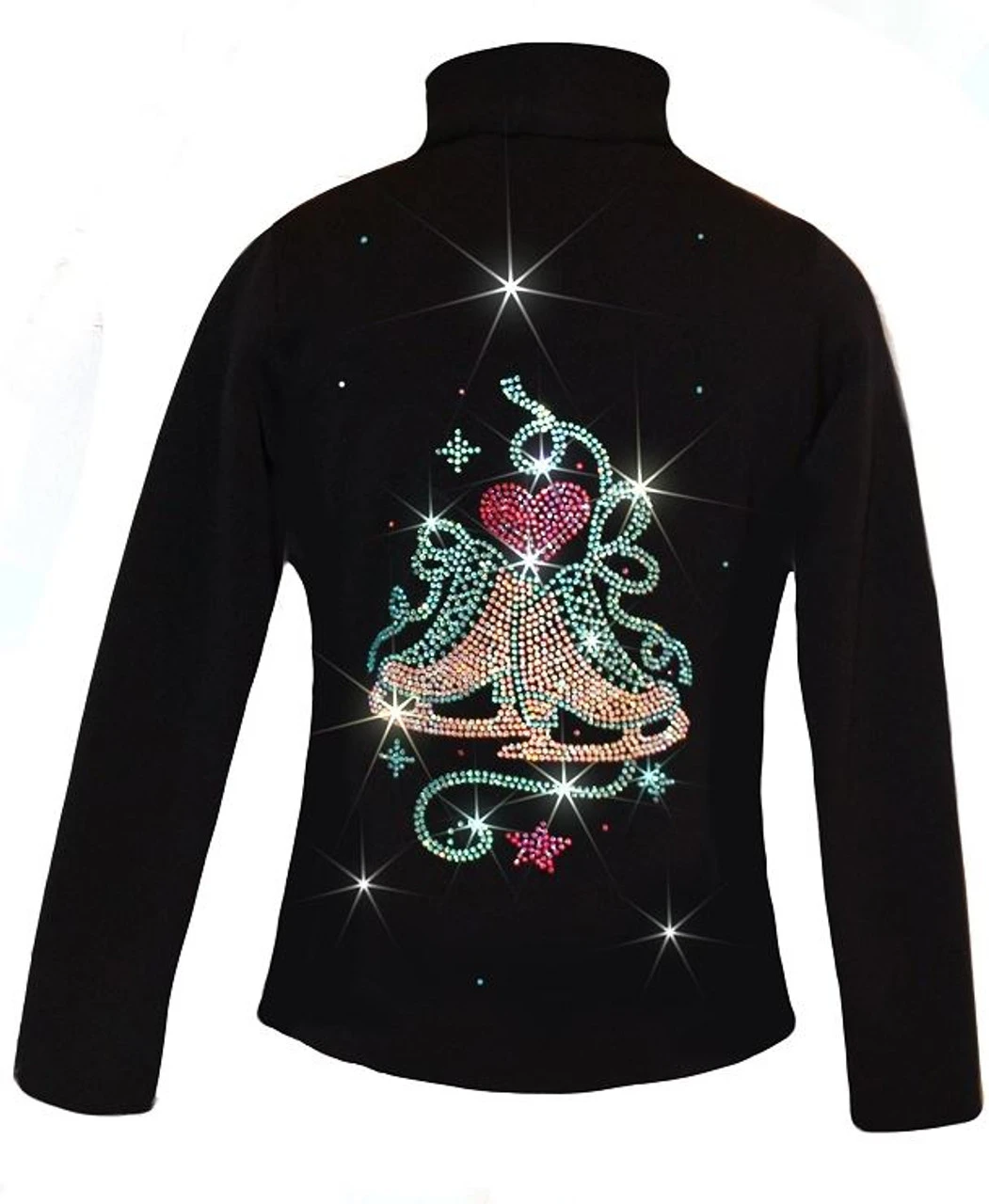 Ice Skating Jacket with Skate with Heart rhinestones design. Feature fitted style, polartec power stretch fabric and three vibrant rhinestones colors – AB Clear, AB Fuchsia, AB Aqua. Hit the ice with New and Exclusive rhinestonized Jacket from IceFireSkateWear.com. Women and girls sizes available.