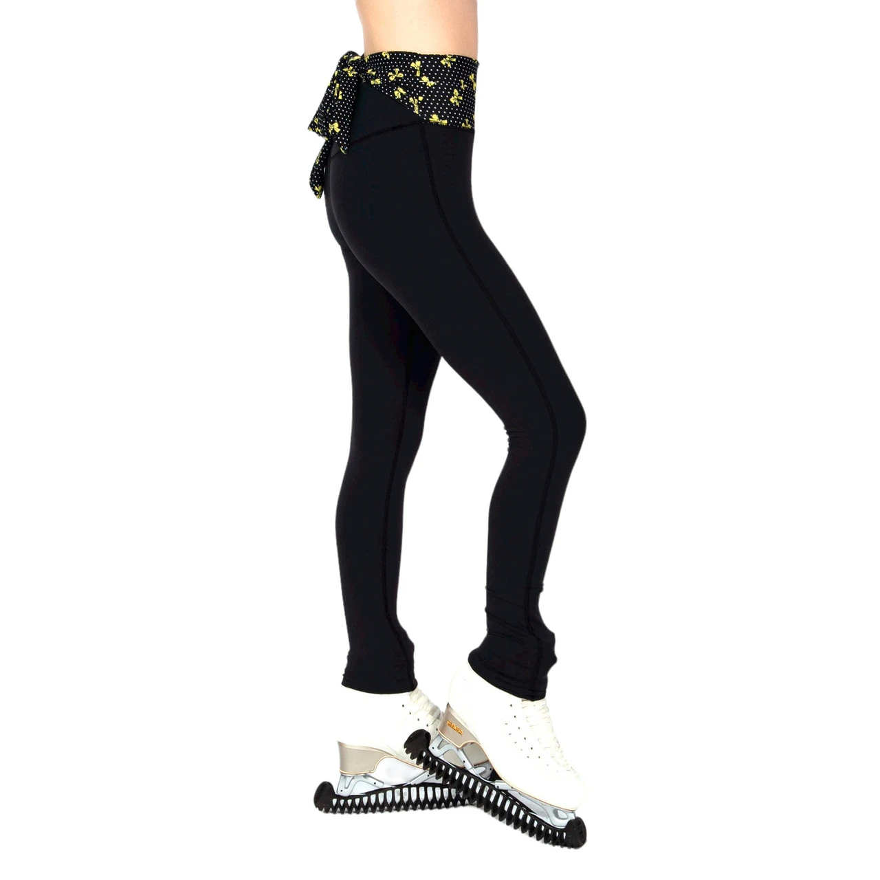 Black supplex leggings with flat stitched seams and a wide waistband in dainty print bows that ties at the small of the back.