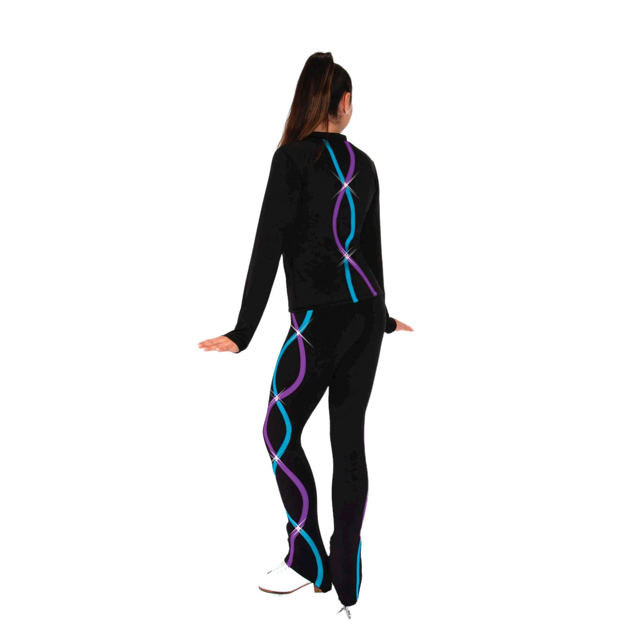 Warm fleece jacket with co-ordinating ribbons of contrasting colour down the back and crystal details where they cross paths. Full front zipper and zippered side pockets.
