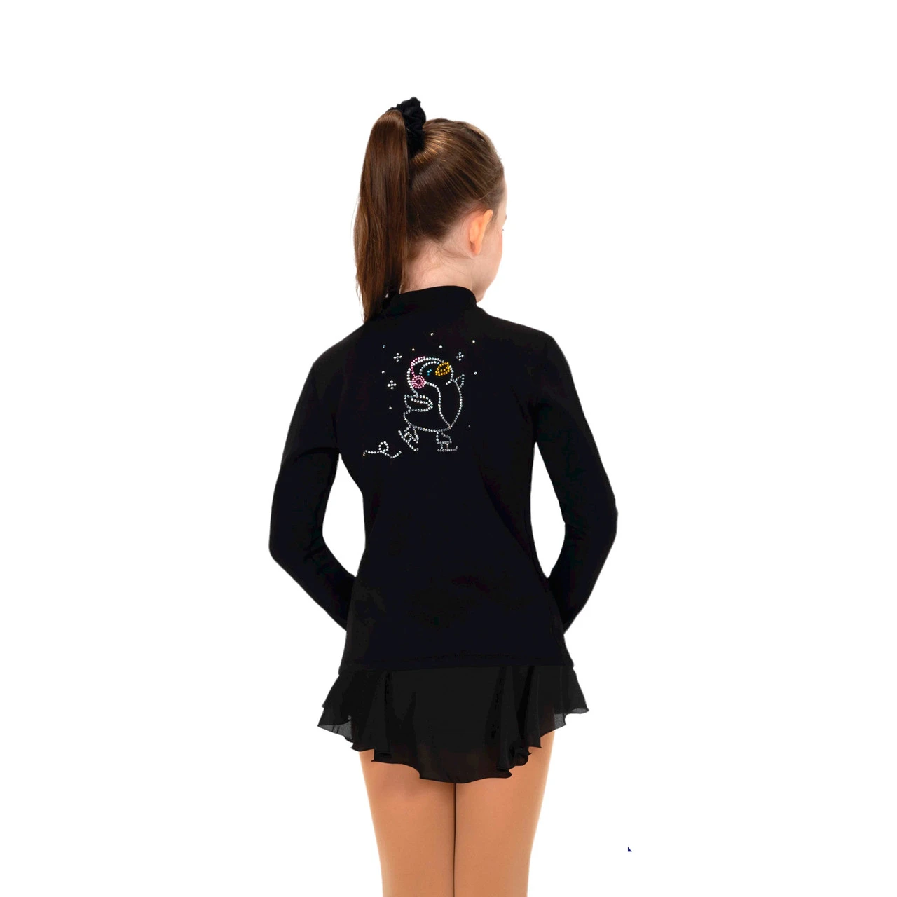 Black fleece jacket with full front zipper and adorable skating animals in sparkling crystals gliding across the back.